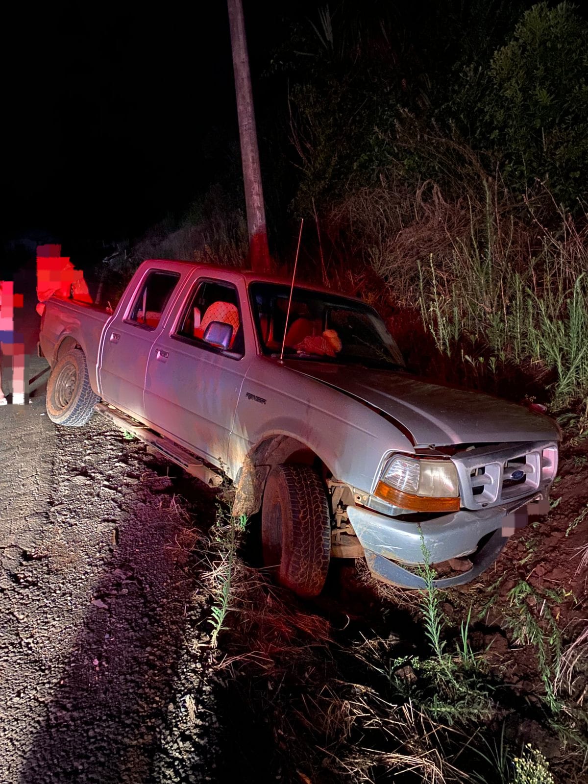 No local os socorristas constataram uma saída de pista, seguida de colisão em barranco, de uma Ford Ranger.