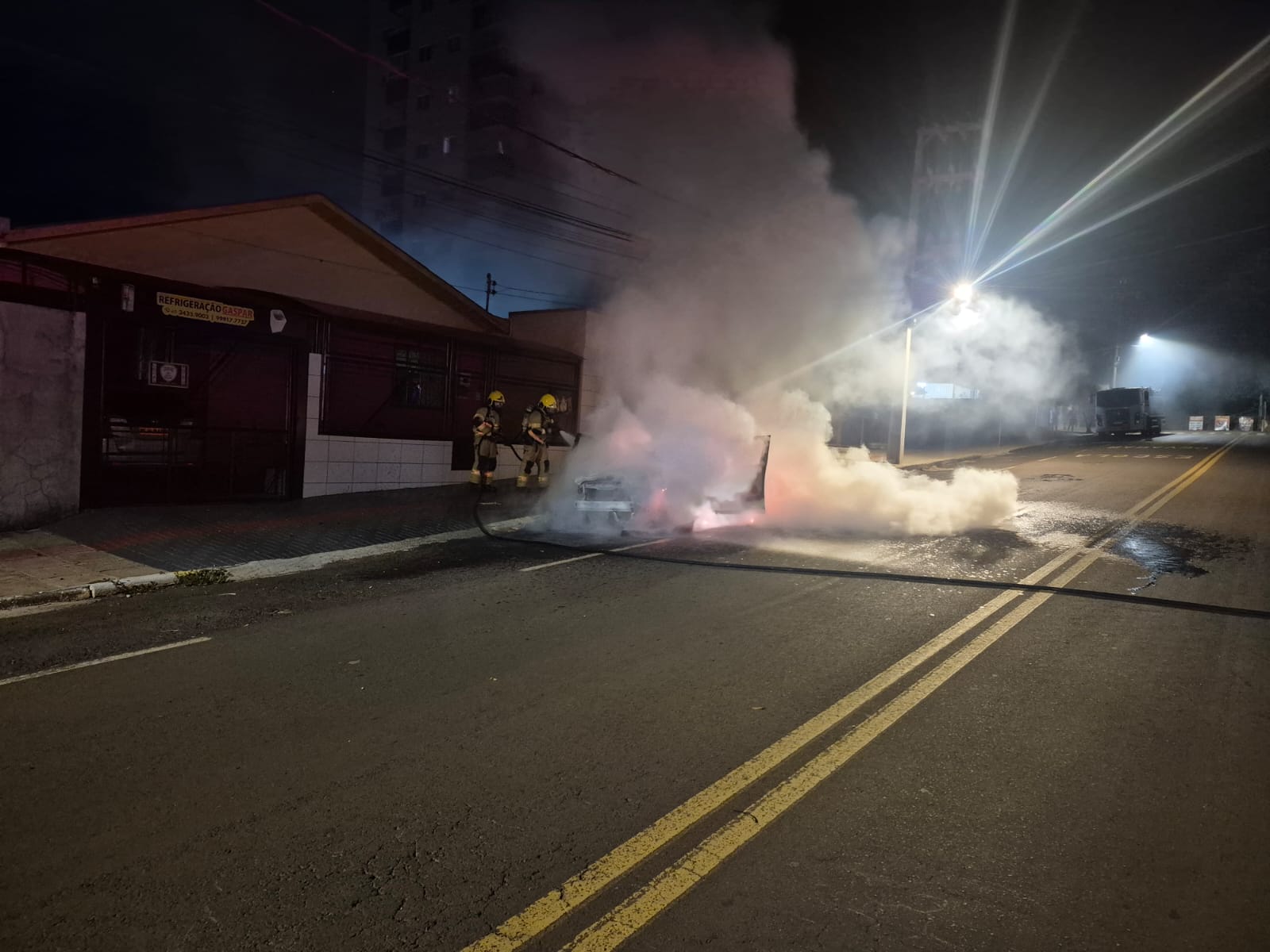 Um veículo foi completamente destruído por um incêndio na madrugada desta segunda-feira (09), em Xanxerê. A ocorrência foi registrada por volta das 3h40, na Rua Emílio Allet.
