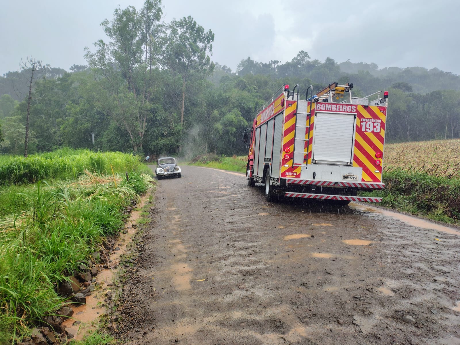 Ao chegar ao local, os bombeiros confirmaram que se tratava de um Volkswagen Fusca, que já estava praticamente todo consumido pelas chamas, restando apenas alguns focos de fogo ainda ativos.