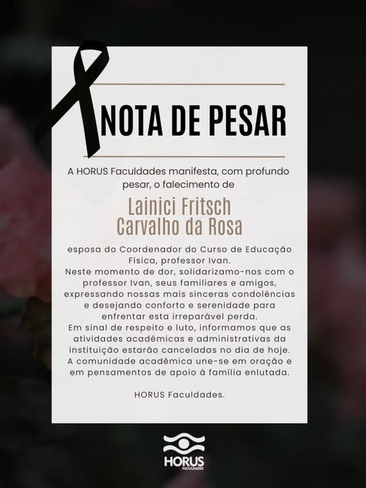 Foi confirmado na tarde desta terça-feira (24), o falecimento de Lainici Fritsch Carvalho da Rosa, esposa do Professor Ivan Coordenador do Curso de Educação Física da Horus Faculdades.