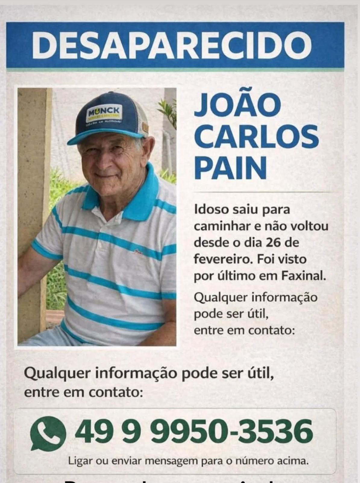 Um idoso de 72 anos, identificado como João Carlos Pain, foi encontrado morto na tarde deste domingo (1º) em um rio no distrito da Barra Grande, em Faxinal dos Guedes. A vítima sofria de Alzheimer e estava desaparecida desde o dia 27 de fevereiro, quando saiu de Xanxerê em direção ao município.
