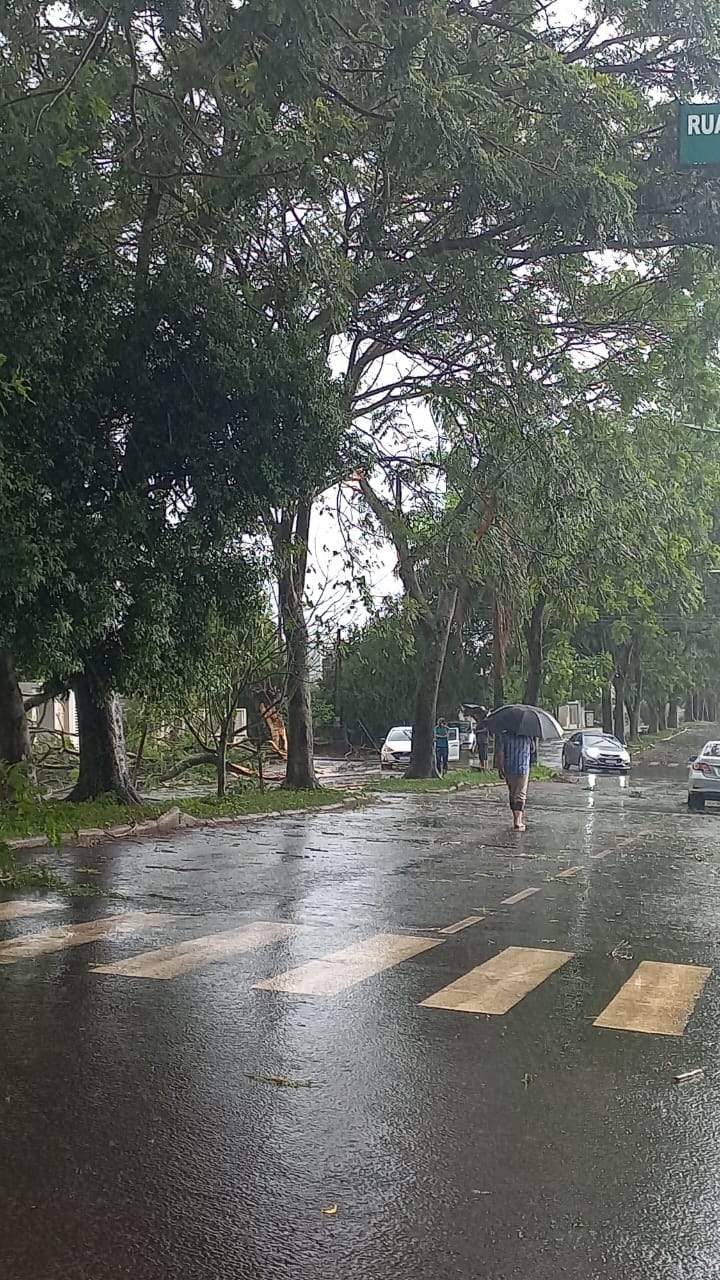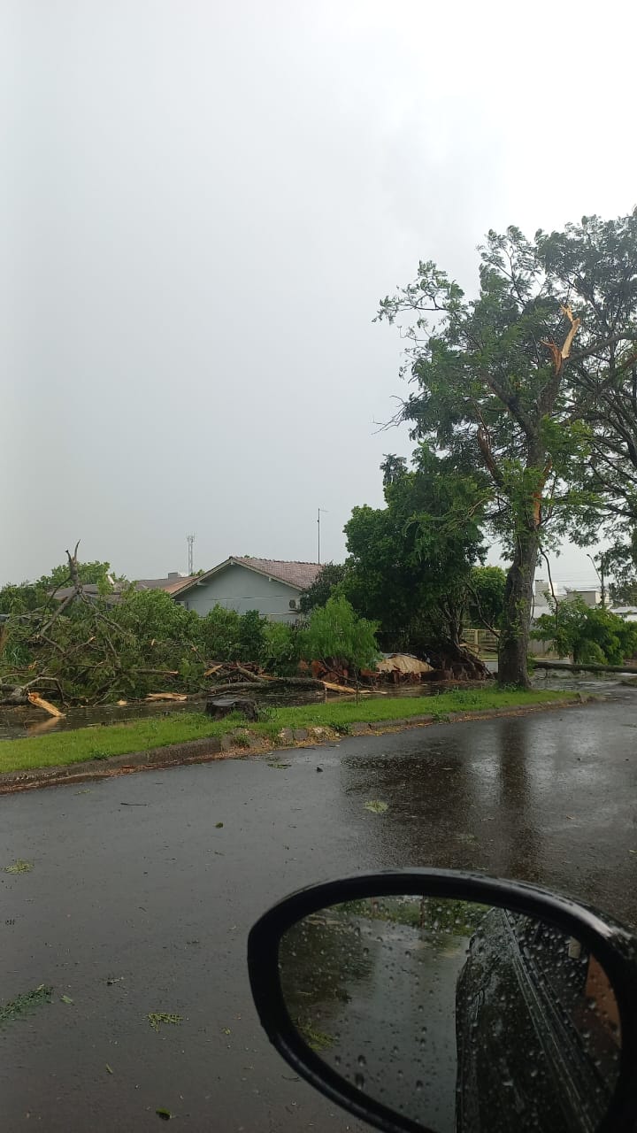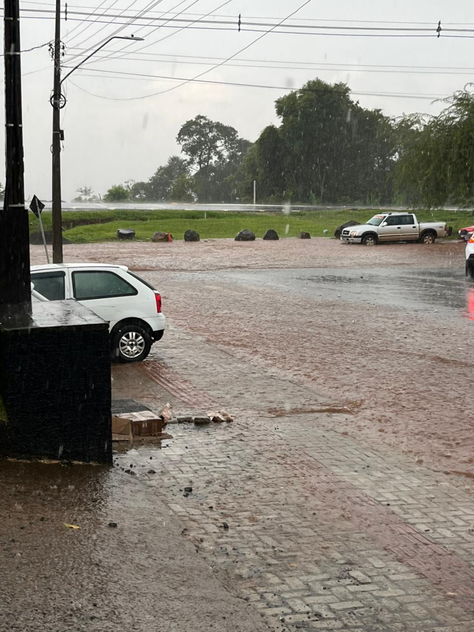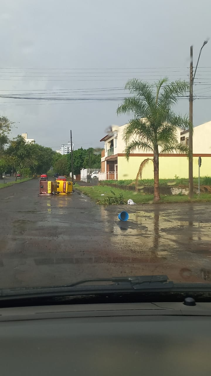 Além disso, galhos de árvores caíram em alguns pontos da cidade. Em frente à Primazzo, um galho atingiu duas motos estacionadas, causando apenas danos leves. Um lixeiro também foi deslocado para quase o meio da pista na Avenida Brasília, próximo à obra da nova sede do Sicredi.